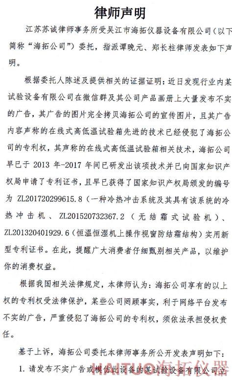海拓儀器律師聲明:反對侵權行為 維護公司和消費者權益摘要:國內(nèi)試驗設備領先者吳江市海拓儀器設備有限公司委托律師事務所發(fā)布了律師聲明,該聲明指出,當前市面上出現(xiàn)了產(chǎn)品專利侵犯海拓儀器權益,海拓儀器將以法律手段維護自身利益。該律師聲明要求某試驗設備有限公司立即停止侵權行為,扯下其在網(wǎng)絡平臺的相關廣告和宣傳畫冊并同時停止生產(chǎn)同款設備。如果該設備公司不聽勸解,海拓儀器將向人民法院依法起訴該公司侵權行為,以維護自身合法權益和維護客戶消費權益,并建議廣大消費者仔細甄別相關產(chǎn)品。? ? ? ?近日,吳江市海拓儀器設備有限公司委托律師事務所發(fā)布了律師聲明,該聲明指出,當前市面上出現(xiàn)了產(chǎn)品專利侵犯海拓儀器權益,海拓儀器將以法律手段維護自身利益。??事件源起于海拓儀器發(fā)現(xiàn)市面上有同類設備公司通過完全拷貝海拓儀器產(chǎn)品宣傳圖片,在微信群及該公司產(chǎn)品畫冊上大量發(fā)布不實廣告。??聲明指出,該廣告聲稱的在線式高低溫試驗箱的技術侵犯了海拓儀器的專利權,該產(chǎn)品專利由海拓儀器 -